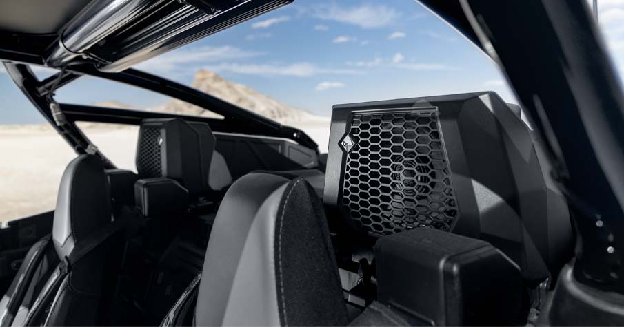 - Sistema de audio Rockford Fosgate Stage 4 afinado e integrado de fábrica con unidad fuente RIDE COMMAND. Incluye: (1) amplificador digital de 8 canales de 1500 W, (2) tweeters de 1" de 100 W, (2) bocinas frontales componentes de 6.5" y 100 W, (2) bocinas traseros coaxiales de 6.5" y 100 W, y (1) subwoofer de 10". El sistema de audio ha sido probado con inmersión en agua IPX7 e IPX9K para resistir los elementos húmedos.